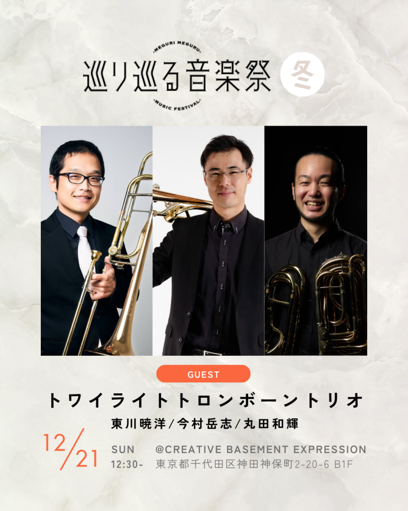 今村はい。母体の「トワイライト・トロンボーン・カルテット」は、2008年に結成した4人組です。現在は、私と東川暁洋と廣田純一の3人がコアメンバーになっています。今回は廣田くんが来られないので、素晴らしいバストロンボーン奏者である丸田和輝さんをゲストに迎えて、私と東川さんとの3人のトリオ編成でお届けします。