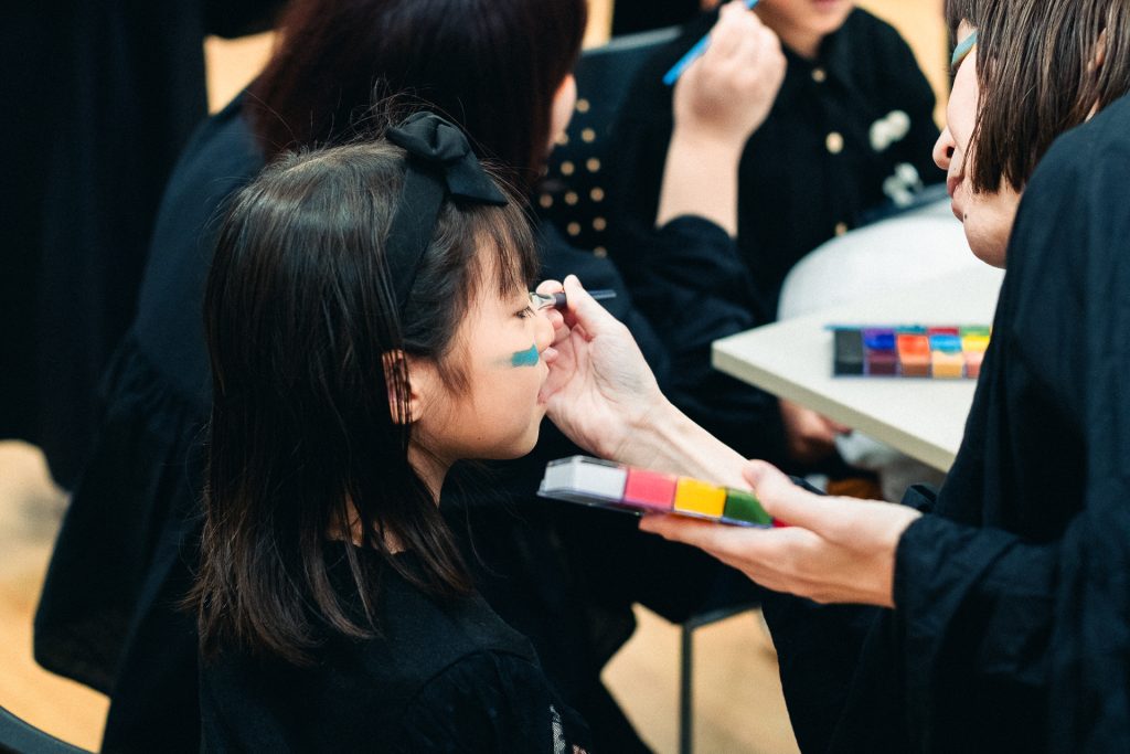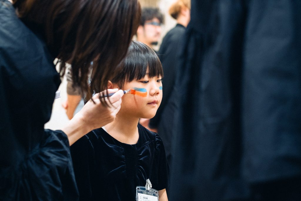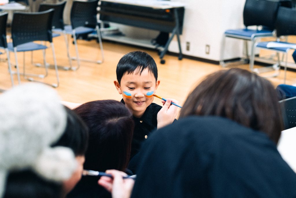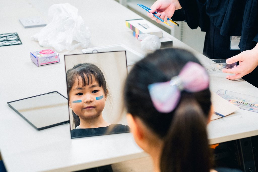 フェイスペイントをした本番の姿を、お父さんやお母さんにもじっくり見てもらいます。