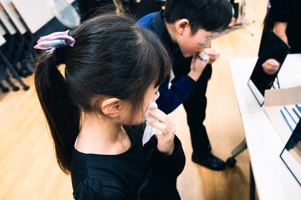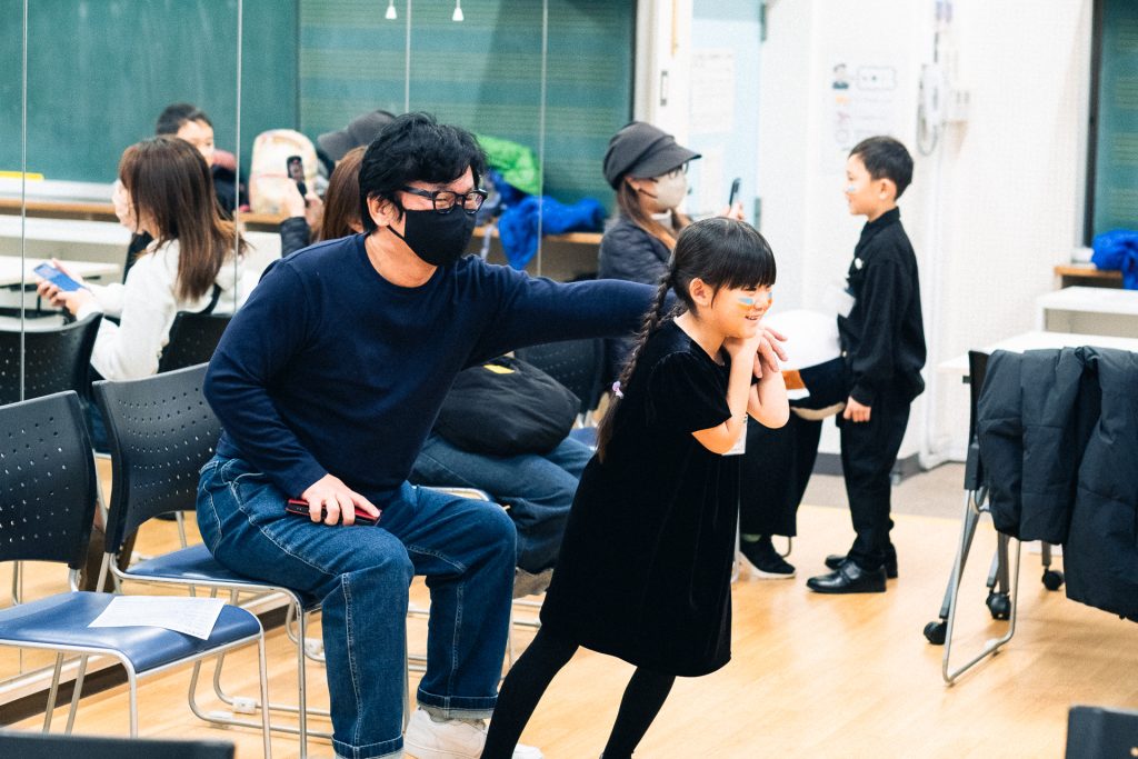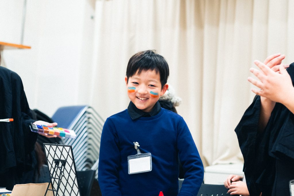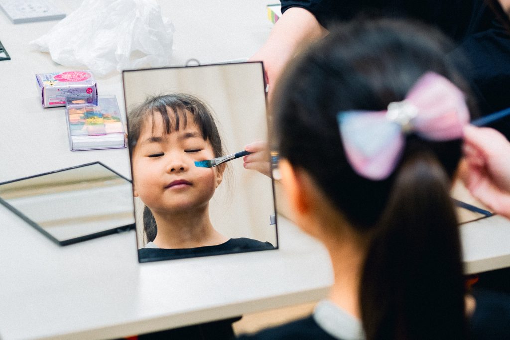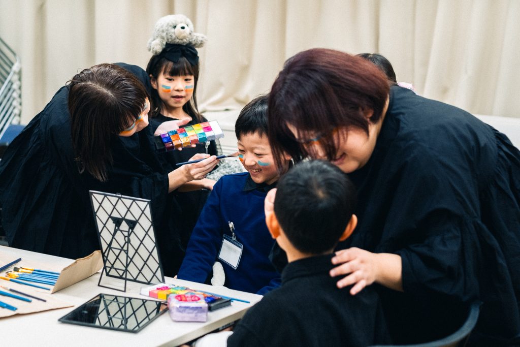 フェイスペイントをした本番の姿を、お父さんやお母さんにもじっくり見てもらいます。