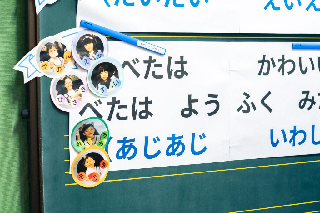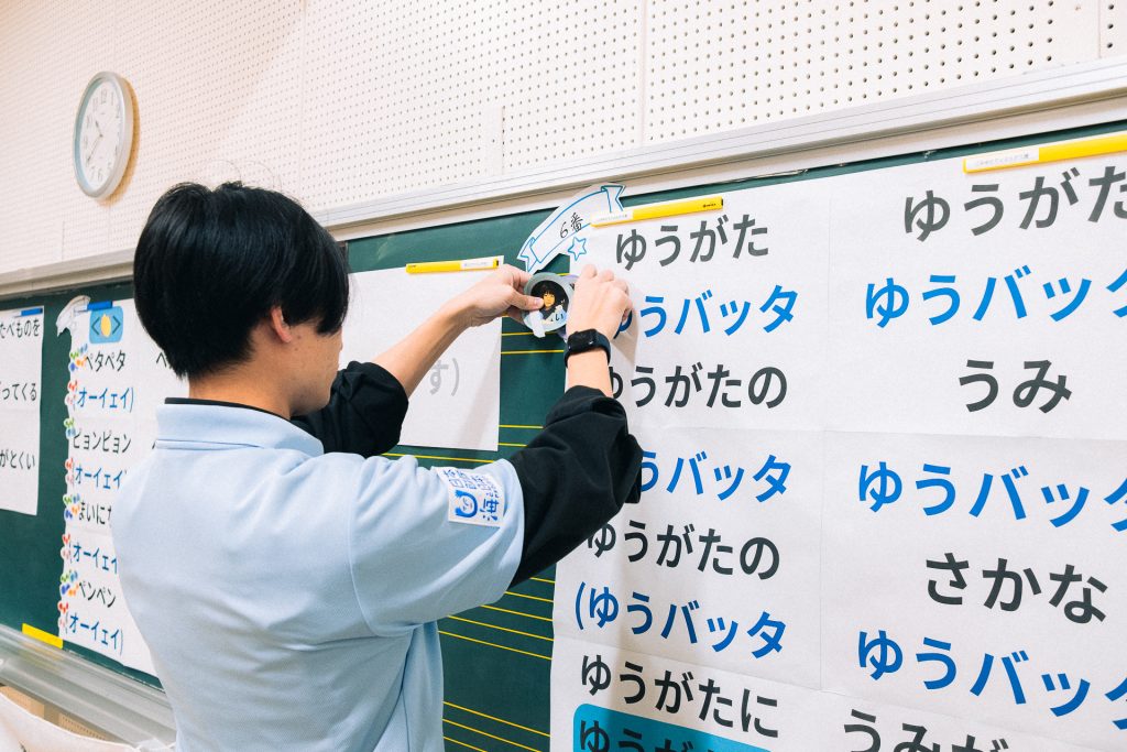 黒板の歌詞カードでは、みんなの写真入りでパートが分かるように。